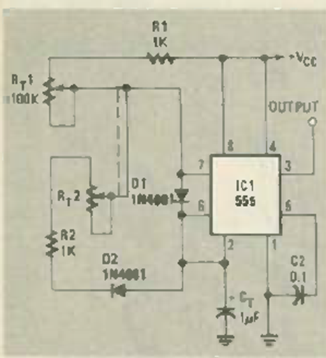 With this circuit it is possible to vary the frequency of a 555 while keeping the duty cycle constant. The circuit is from a Radio Electronics magazine from July 1985.