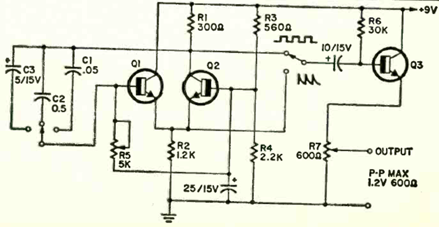 This circuit can be used in a toy organ. The frequencies are determined by the capacitors selected by a switch. Trimpots switched by a keyboard can be used. The circuit is from a Radio Electronics from May 1970.