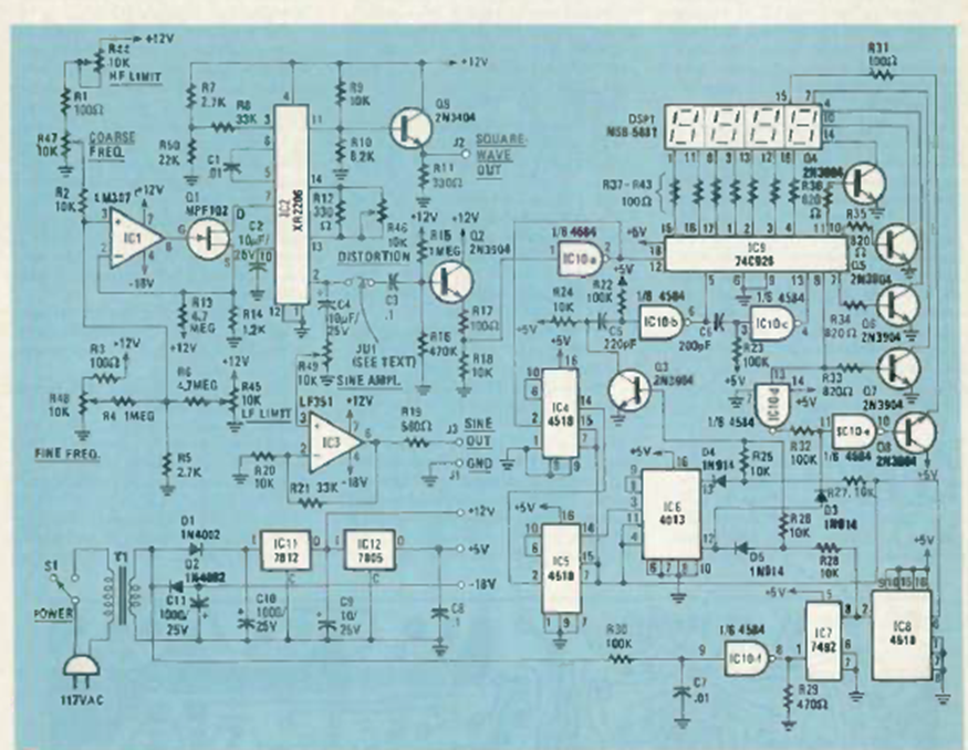 This sophisticated audio generator with digital display was found in the March 1984 issue of Radio Electronics magazine. The circuit includes a power supply with various voltages.