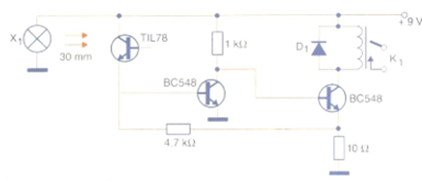 This circuit uses two transistors in a direct coupling configuration and directly activates a relay whose characteristics depend on the supply voltage used. The relay's activation current must be a maximum of 50 mA, and the voltage drop across the 10 Ω feedback resistor must be considered. The light source is a small low-voltage lamp, which has its light focused on the phototransistor at up to 3 cm. More powerful sources and optical resources can increase this distance. The 1 k ohm resistor can eventually be changed according to the desired activation characteristics for the circuit. The figure shows the complete diagram of this passage detector.