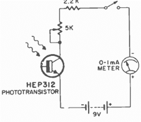 This simple photometer uses a 1 mA milliammeter and a common phototransistor. The circuit has its scale adjusted by a trimpot. The circuit is from a Radio Electronics from April 1971.