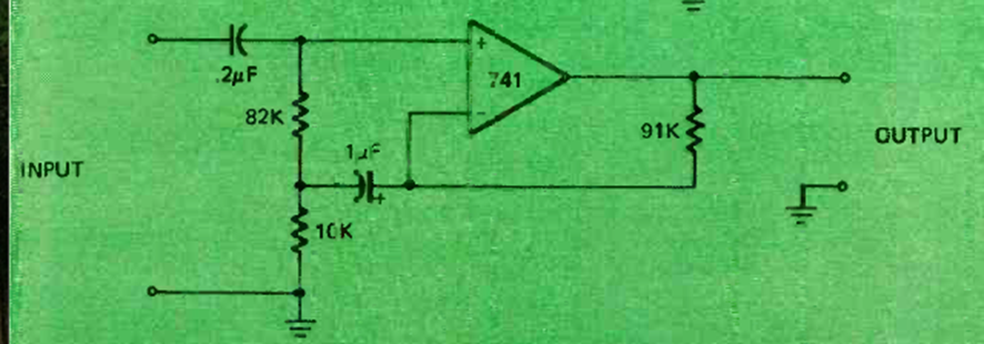 This is a traditional 741 configuration with gain close to 100. We found it in the December 1972 Radio Electronics magazine. The power source must be dual.