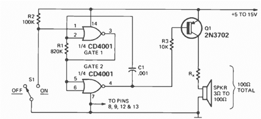 This alarm oscillator was found in the December 1974 issue of Radio Electronics magazine. Rx depends on the power supply and the desired power and can be between 10 and 47 ohms. For more power, a BD136 or TIP32 for the transistor is used (reduce R3 to 1k).