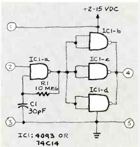 This circuit shows how to use the remaining gates of a 4093 or 74C14 as amplifiers. The circuit has the supply voltage according to the technology used. The frequency depends on R1 and C1.