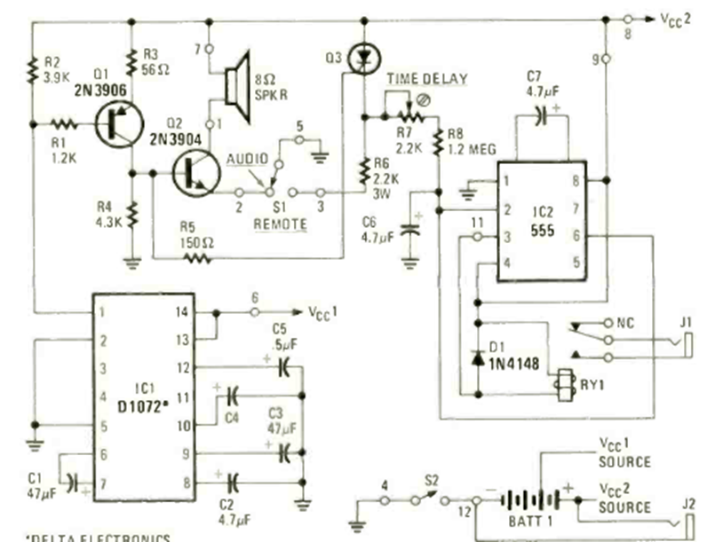 We found this circuit in April 1979 Radio Electronics magazine. The circuit is based on the 555 and an integrated circuit of the time, including the audible warning and the activation of a relay.