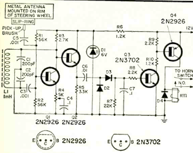 This approach alarm circuit was found in the September 1970 Radio Electronics issue. The 1 mH coil is wound on a ferrite rod. The relay is 12 V sensitive.