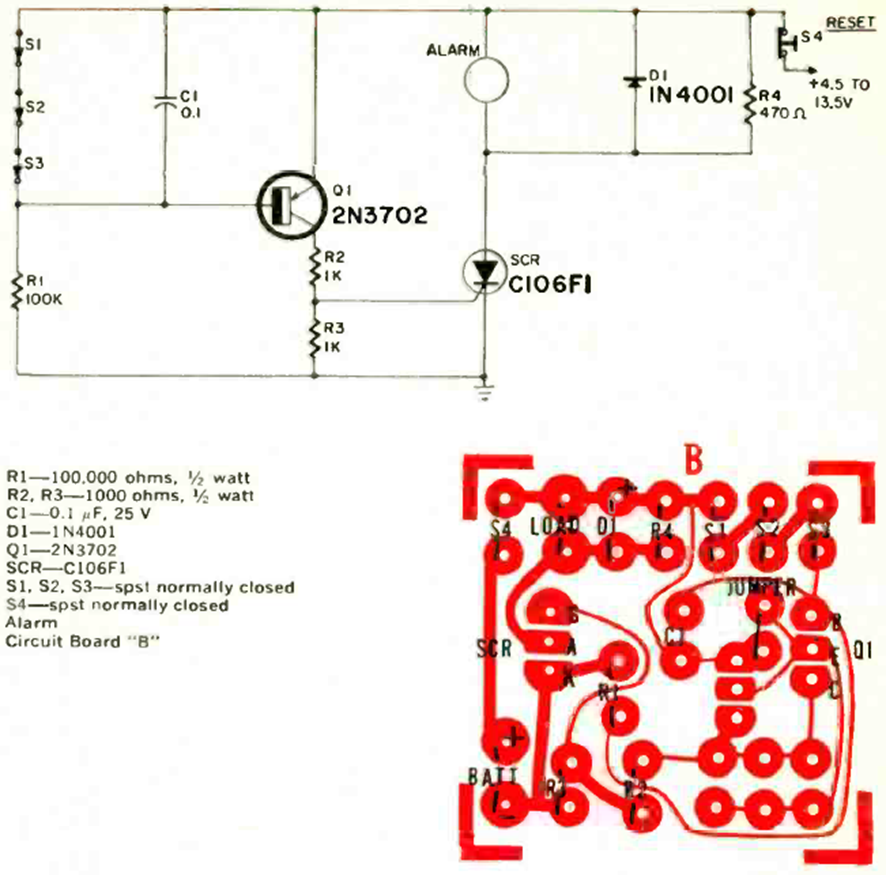 Using a 106 series SCR, this circuit was found in the May 1971 Radio Electronics magazine. The quiescent current is very low and is given by the value of R1.