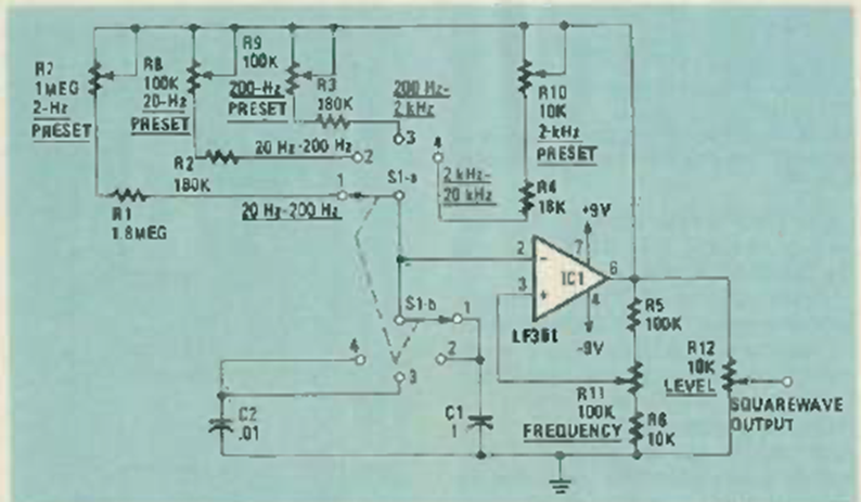 This circuit generates rectangular signals from 2 Hz to 20 kHz using an operational amplifier. The circuit is from 1984 Radio Electronics. The power supply must be symmetrical.