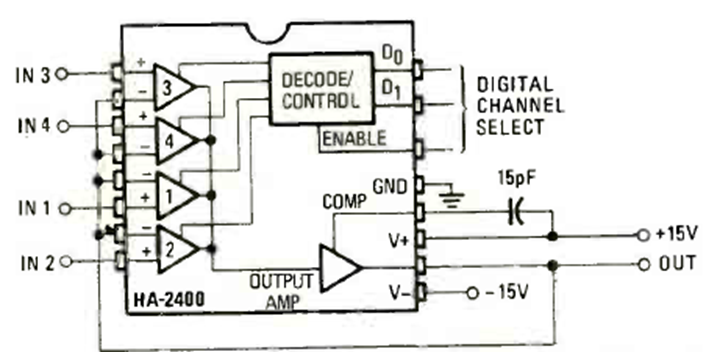 This circuit featuring a new quadruple operational amplifier was found in the March 1980 issue of Radio Electronics magazine. The circuit is to be powered by a symmetrical 15 V source.