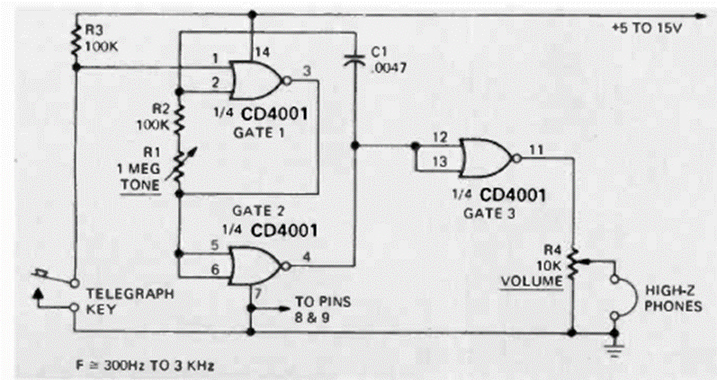 Indicated for telegraphy practice, this circuit was found in the Radio Electronics magazine of December 1974. The circuit is for high impedance headphones and can be powered by voltages from 5 to 15 V.