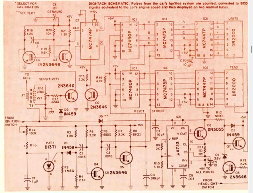 This circuit was found in the April 1973 issue of Radio Electronics magazine. Using TTL technology, it was recommended for vehicles of the time. The circuit was connected to the contact breaker.