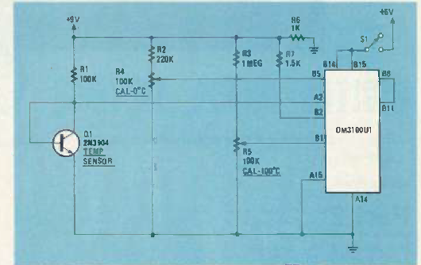 This circuit was found in the March 1984 issue of Radio Electronics magazine. The sensor is a transistor. The module is a common type at the time.