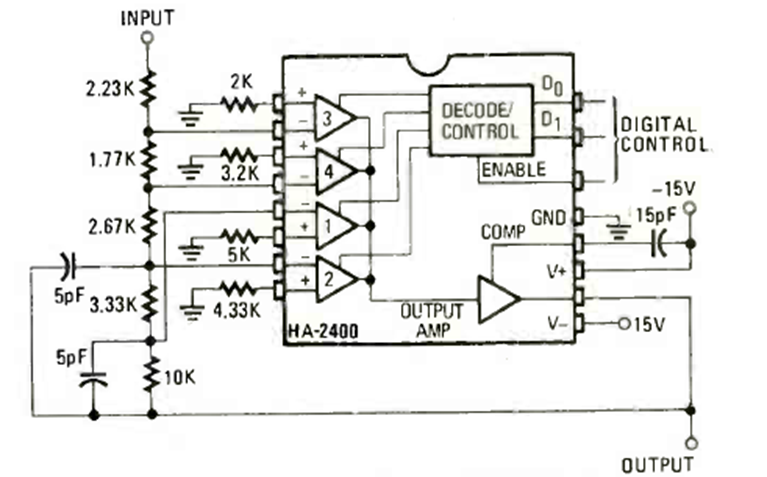 This circuit with the HA2400 was found in the March 1980 Radio Electronics magazine. The circuit has digital-gain control and must be powered by a symmetrical 15 V source.