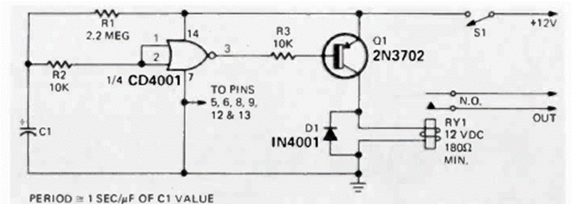This circuit activates a relay after a time given by C1 and R1. The circuit is from a Radio Electronics from December 1974. The relay voltage is the same as that used in the power supply.