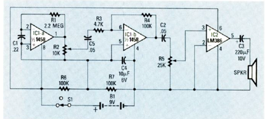 This circuit was found in the July 1986 issue of Radio Electronics magazine. The circuit has a loudspeaker warning system. The sensor is the ceramic capacitor C1 which acts as a transmission line.