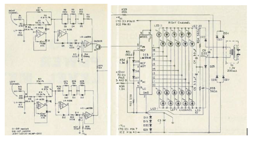 This circuit was found in the February 1980 issue of Radio Electronics magazine. The digital circuit was shown in two parts, using 20 LEDs in a configuration with the LM3914.