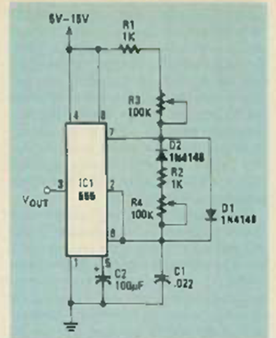 Found in September 1984 Radio Electronics issue this circuit has adjustable pulse width and interval. The circuit has the base frequency given by C1.