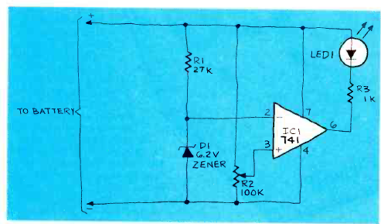 This circuit is for 12 V batteries but can be used with batteries of other voltages by changing the zener diode. The trigger point is adjusted by R1. The operating system accepts equivalents.