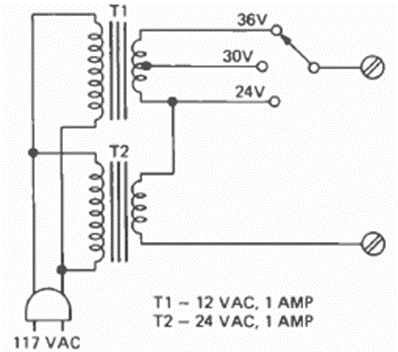 This circuit with two transformers shows how to obtain multiple voltages by combining their secondary windings. The circuit is from a Radio Electronics magazine from May 1975.