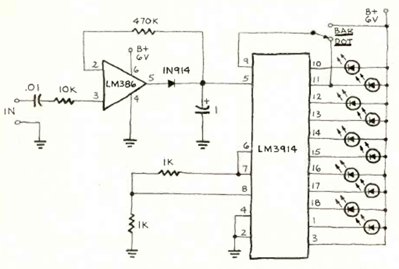 In the figure we have a simple way to have a peak bargraph indicator. The amplifier is of the audio type, but operational ones can be used. The circuit is from Radio Electronics from March 1980.