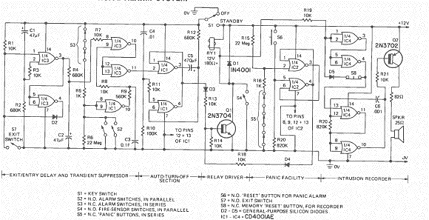 This circuit was found in an article in Radio Electronics magazine from May 1975. The circuit has several features and is powered by a 12 V source or battery.