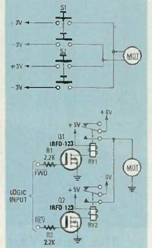 This motor logic control was found in the September 1985 issue of Radio Electronics magazine. The relay is in accordance with the logic circuit and the motor can have other supply voltages.