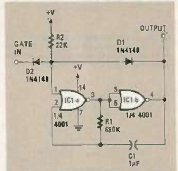 We found this circuit in the November 1984 Radio Electronics magazine. The circuit has the output normally at a high level and is triggered by a low pulse when it oscillates at a frequency given by C1.