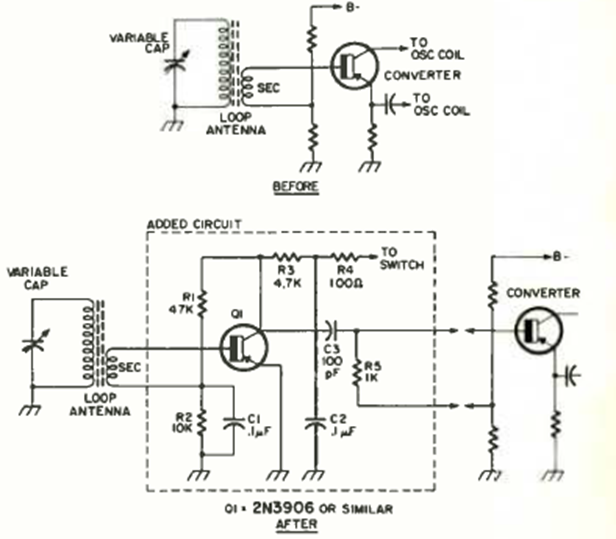 This antenna amplifier circuit for medium wave radios was obtained from the April 1972 Radio Electronics magazine. The ferrite coil is for the medium wave band and the transistor is general purpose.