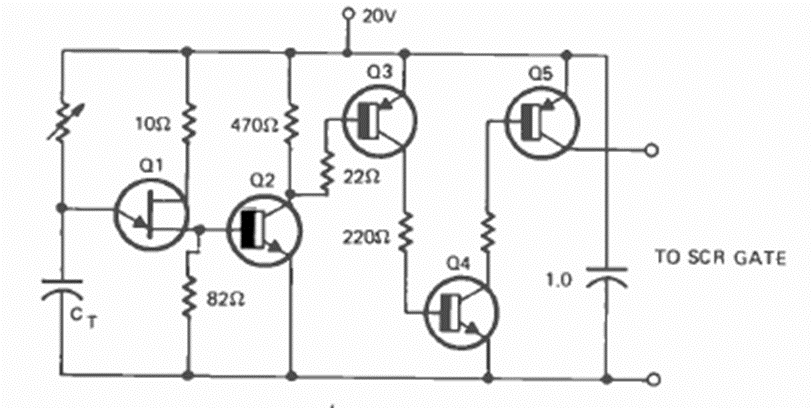 This unijunction transistor trigger pulse generator circuit was found in the March 1973 issue of Radio Electronics magazine. Typical values for Re CT are 100k and 220 nF.