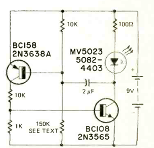 This LED constant current source circuit is from Radio Electronics magazine, November 1972. The transistors are usually older versions of the BC558 and BC548. The current is 2 mA.