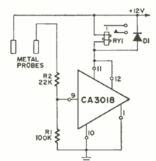 Using the CA3018 released at the time, this circuit was found in the August 1970 Radio Electronics magazine. The relay is a sensitive type of 50 mA or less current.
