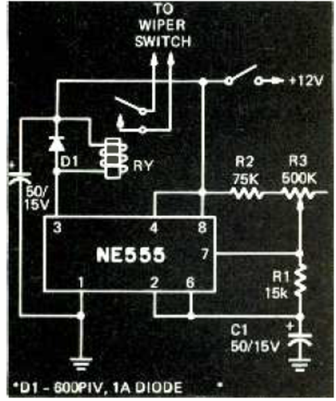 This windshield wiper intervalor was found in the July 1974 issue of Radio Electronics magazine. Note that the star is the 555, whose range of applications continues to this day.