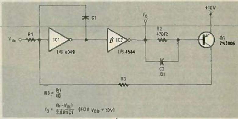 Found in the September 1984 issue of Radio Electronics magazine, this circuit uses common components. The trigger characteristics are given by the formula in the diagram.