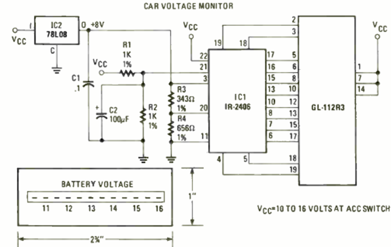Based on an integrated circuit of the time, this circuit appeared in the October 1979 issue of Radio Electronics magazine. The circuit monitors voltages in the range of 10.5 to 16.0 V.