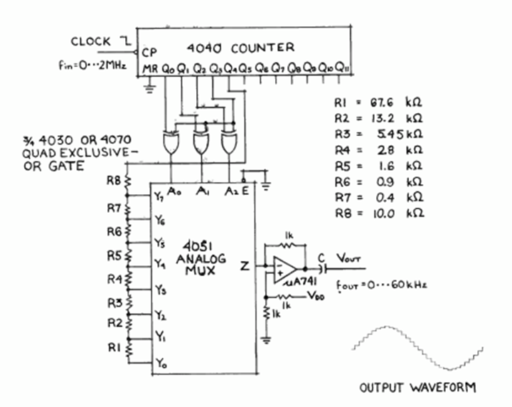 We found this signal generator circuit in the November 1978 issue of Radio Electronics magazine. The circuit uses CMOS circuitry and has a maximum input frequency of 2MHz.