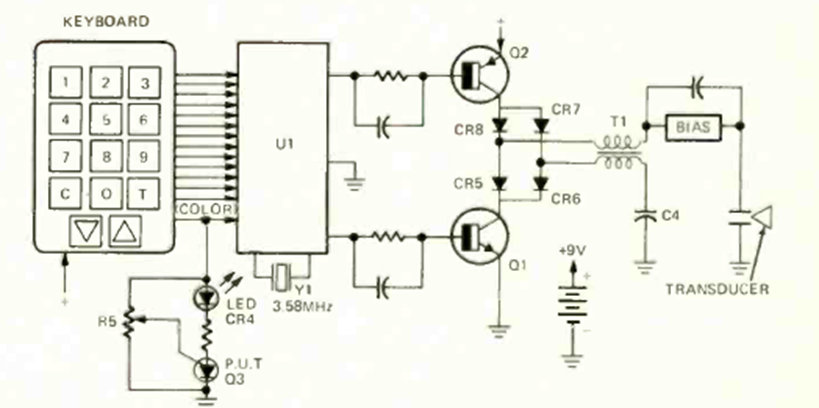 This ultrasonic digital remote-control transmitter was found in the January 1976 issue of Radio Electronics magazine. The components are from the period. The IC is from the period.