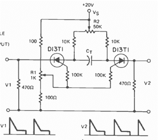 Using two PUTs this circuit generates signals as shown in the figure. The circuit is from a Radio Electronics from March 1973. Note the supply voltage of the circuit.
