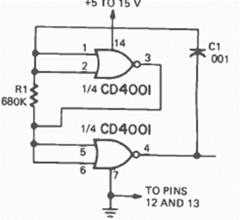 This circuit with increased power output was found in the November 1974 Radio Electronics magazine. The frequency given by C1 and R1 is 1 kHz but can be changed by changing these components.