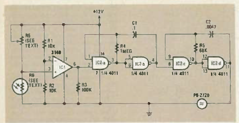Based on the CA3140 IC, this circuit was found in the June 1986 issue of Radio Electronics. Sensitivity adjustment is made using a trimpot in series with the sensor.