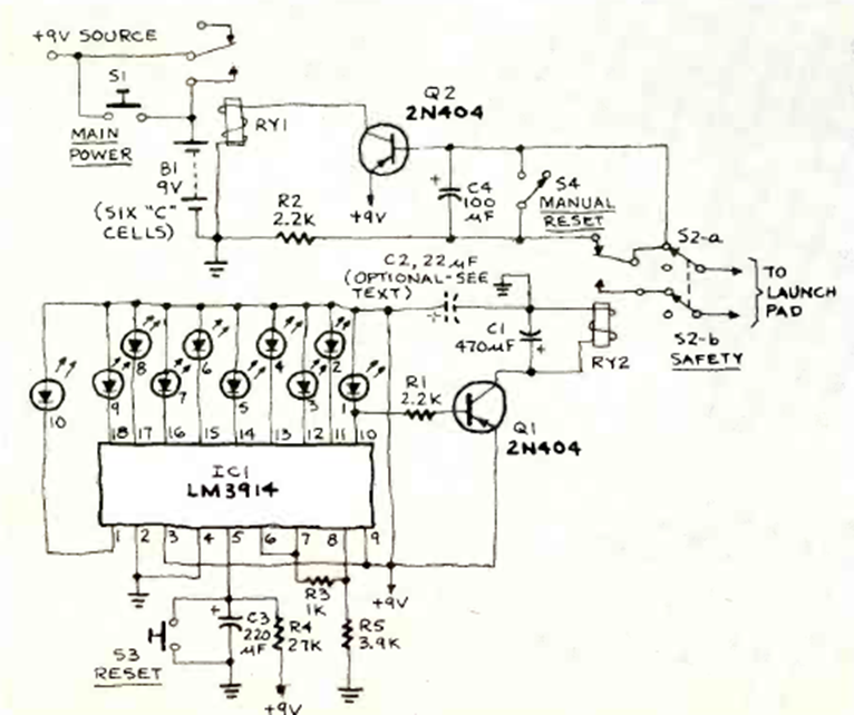 Found in the August 1982 issue of Radio Electronics magazine, this circuit lights LEDs in sequence simulating a countdown and, when signaled, activates a relay connected to the rocket's ignition system. The circuit can operate with other voltages depending on the relay.