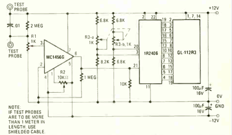We found this circuit in the October 1979 issue of Radio Electronics magazine. It uses a 7016 bargraph indicator, but other equivalents can be used. R2 adjusts the offset or null of the operational amplifier.