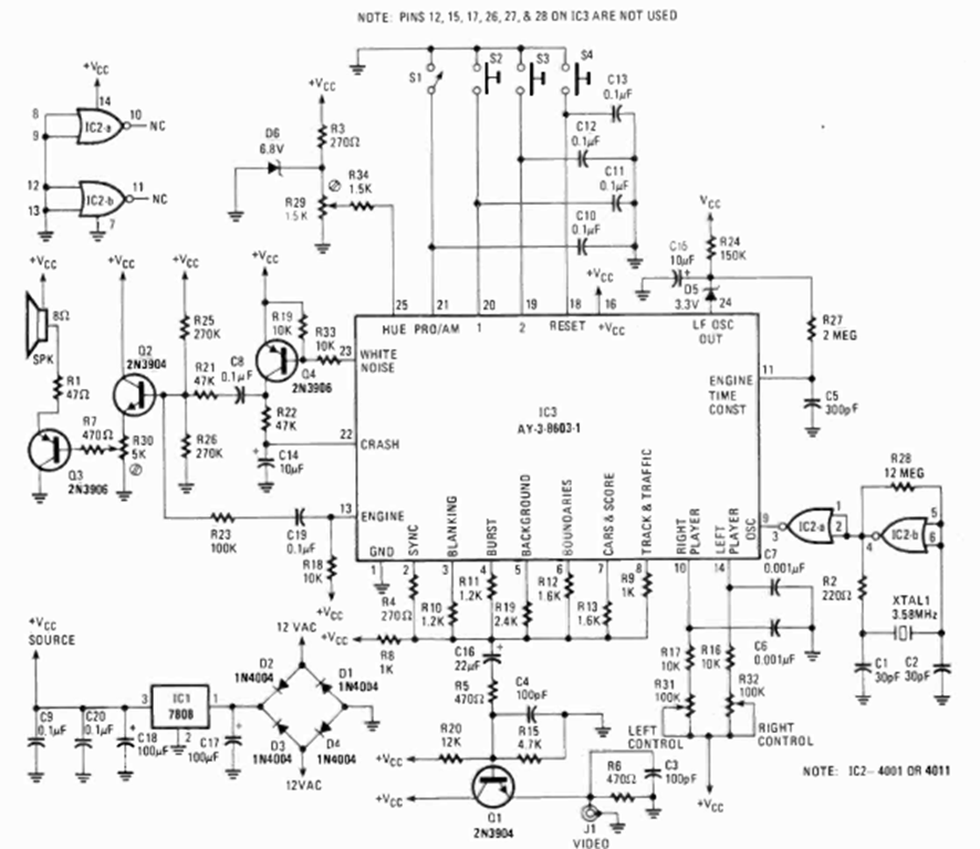 This is the traditional circuit from the 1980 racing video game with the AY3-6603-1 that we also published at the time in our magazines. This circuit is from the Radio Electronics magazine of August 1980.