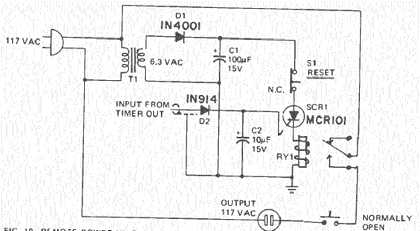 This is a circuit that allows remote activation of a power supply. The circuit was used with a timer of the time. It appeared in the November 1973 issue of Radio Electronics magazine.
