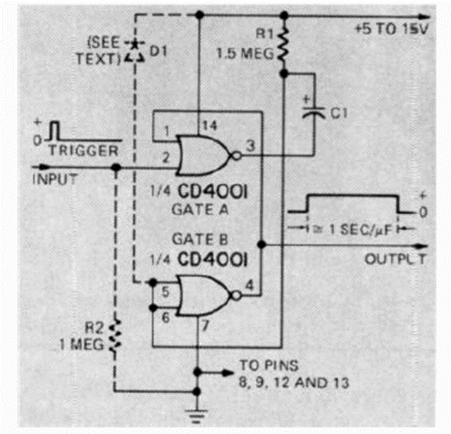 This circuit is from Radio Electronics magazine, November 1974. The supply voltage depends on the application. The time the output remains high depends on the capacitor, typically 1 second for uF as indicated in the diagram.