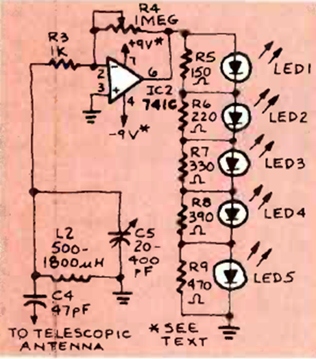 This circuit can be used to detect the signals from the previous circuit or from any radio transmitter. The circuit is from Radio Electronics magazine, April 1982.