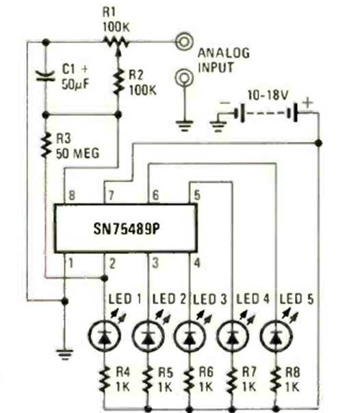 We found this circuit in the Radio Electronics magazine of June 1978. This circuit through the time constant of R1 and R3 makes LED1 blink when the input is less than 200 mV.