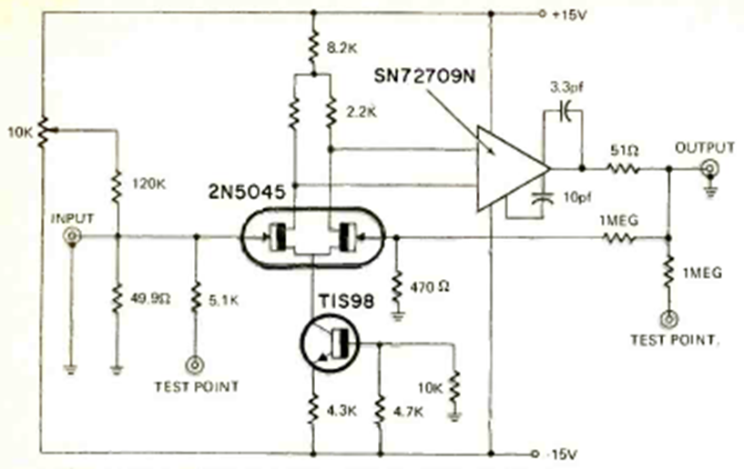 This circuit was suggested by Texas Instruments in the January 1973 issue of Radio Electronics magazine. The transistor is a matched pair type, and the operational transistor is the well-known 709 with the Texas acronym SN and 72 to indicate linear.