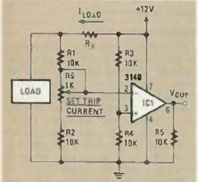 This circuit trips when the current in a load exceeds the programmed value that depends on Rx. The circuit is from the Radio Electronics magazine of June 1986.