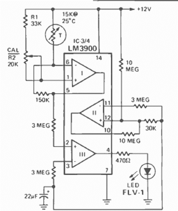 The purpose of this circuit with the LM3900 is to detect the outside temperature by triggering an LED indicator when it is below zero. The circuit is from a Radio Electronics magazine from January 1975.