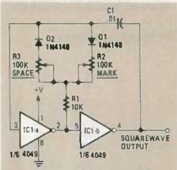 With mark and space adjustment this circuit was found in November 1984 Radio Electronics. The base frequency depends on C1.